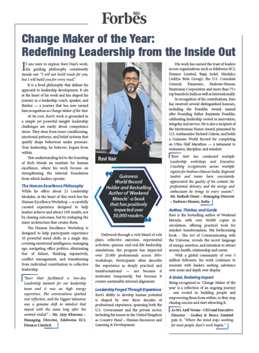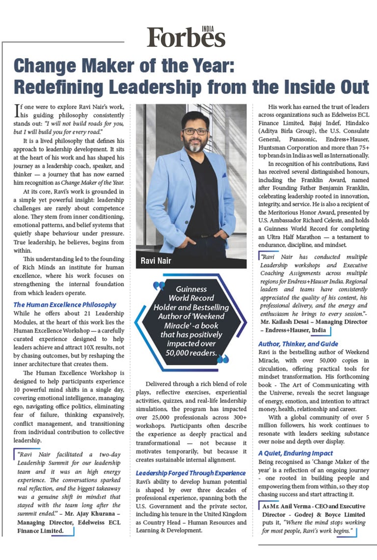 "Where the mind stops working for most people, Ravi’s work begins. That edge is what sets him apart as a leadership trainer."
